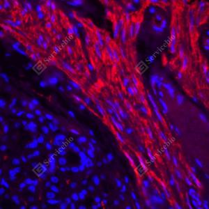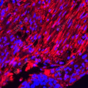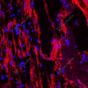 IF检测Fibronectin蛋白(货号 YB152104)(红色). 样品: 大鼠胃, 4%多聚甲醛 (货号Y1112) 固定12-24小时. 抗原修复: 柠檬酸抗原修复液(干粉, pH 6.0) (Y1212), 高压锅均匀喷气计时2分钟. 封闭: 3% BSA(货号YC305021)的PBS溶液, 室温孵育30分钟. —抗: 1: 3000稀释, 4℃ 孵育过夜. 二抗: Cy3标记山羊抗兔IgG (H+L) (货号YB21314), 1: 300稀释, 室温孵育1小时. |
