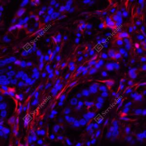IF检测Fibronectin蛋白(货号 YB152104)(红色). 样品: 人肺癌, 4%多聚甲醛 (货号Y1112) 固定12-24小时. 抗原修复: 柠檬酸抗原修复液(干粉, pH 6.0) (Y1212), 高压锅均匀喷气计时2分钟. 封闭: 3% BSA(货号YC305021)的PBS溶液, 室温孵育30分钟. —抗: 1: 3000稀释, 4℃ 孵育过夜. 二抗: Cy3标记山羊抗兔IgG (H+L) (货号YB21314), 1: 300稀释, 室温孵育1小时. |