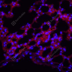 IF检测Fibronectin蛋白(货号 YB152104)(红色). 样品: 小鼠肺, 4%多聚甲醛 (货号Y1112) 固定12-24小时. 抗原修复: 柠檬酸抗原修复液(干粉, pH 6.0) (Y1212), 高压锅均匀喷气计时2分钟. 封闭: 3% BSA(货号YC305021)的PBS溶液, 室温孵育30分钟. —抗: 1: 3000稀释, 4℃ 孵育过夜. 二抗: Cy3标记山羊抗兔IgG (H+L) (货号YB21314), 1: 300稀释, 室温孵育1小时. |