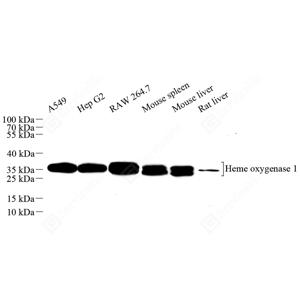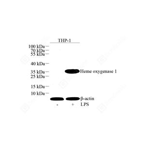WB检测Heme Oxygenase 1蛋白(货号 YB15560). 样品: 经RIPA裂解液(货号Y2013)处理的蛋白质. 封闭: 3%脱脂牛奶(货号YC310012)溶于TBST溶液, 室温孵育1小时. —抗: 1: 1000稀释, 4℃ 孵育过夜. 二抗: HRP标记山羊抗兔IgG (H+L) (货号YB23314), 1: 5000稀释, 室温孵育1小时. |