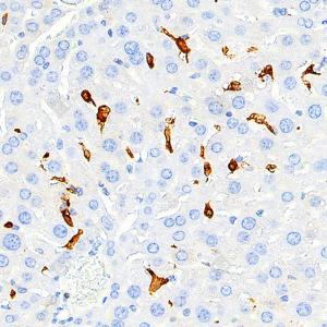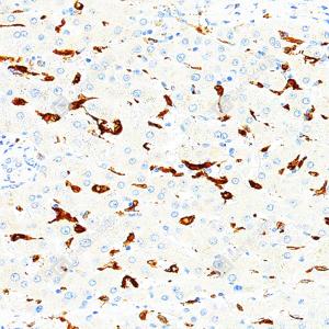 IHC检测Heme Oxygenase 1蛋白(货号 YB15560). 样品: 小鼠LPS诱导(6h)肝脏炎症模型, 4%多聚甲醛 (货号Y1112) 固定12-24小时. 抗原修复: 柠檬酸抗原修复液(干粉, pH 6.0) (Y1212), 高压锅均匀喷气计时2分钟. —抗: 1: 500稀释, 4℃ 孵育过夜. 二抗: S-vision免疫组化多聚二抗(山羊抗兔),即用型 (货号Y1313), 室温孵育20分钟. |