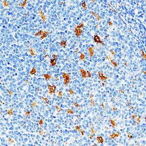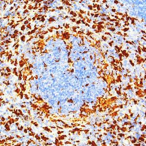 IHC检测Heme Oxygenase 1蛋白(货号 YB15560). 样品: 人扁桃体, 4%多聚甲醛 (货号Y1112) 固定12-24小时. 抗原修复: 柠檬酸抗原修复液(干粉, pH 6.0) (Y1212), 高压锅均匀喷气计时2分钟. —抗: 1: 500稀释, 4℃ 孵育过夜. 二抗: S-vision免疫组化多聚二抗(山羊抗兔),即用型 (货号Y1313), 室温孵育20分钟. |