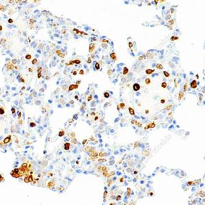 IHC检测Heme Oxygenase 1蛋白(货号 YB15560). 样品: 大鼠LPS诱导(24h)肺部炎症模型, 4%多聚甲醛 (货号Y1112) 固定12-24小时. 抗原修复: 柠檬酸抗原修复液(干粉, pH 6.0) (Y1212), 高压锅均匀喷气计时2分钟. —抗: 1: 500稀释, 4℃ 孵育过夜. 二抗: S-vision免疫组化多聚二抗(山羊抗兔),即用型 (货号Y1313), 室温孵育20分钟. |