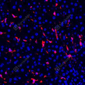 IF检测Heme Oxygenase 1蛋白(货号 YB15560)(红色). 样品: 大鼠纤维化肝脏, 4%多聚甲醛 (货号Y1112) 固定12-24小时. 抗原修复: 柠檬酸抗原修复液(干粉, pH 6.0) (Y1212), 高压锅均匀喷气计时2分钟. 封闭: 3% BSA(货号YC305021)的PBS溶液, 室温孵育30分钟. —抗: 1: 500稀释, 4℃ 孵育过夜. 二抗: Cy3标记山羊抗兔IgG (H+L) (货号YB21314), 1: 300稀释, 室温孵育1小时. |