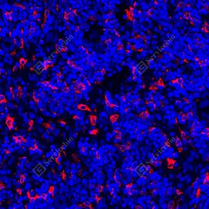 IF检测Heme Oxygenase 1蛋白(货号 YB15560)(红色). 样品: 人扁桃体, 4%多聚甲醛 (货号Y1112) 固定12-24小时. 抗原修复: 柠檬酸抗原修复液(干粉, pH 6.0) (Y1212), 高压锅均匀喷气计时2分钟. 封闭: 3% BSA(货号YC305021)的PBS溶液, 室温孵育30分钟. —抗: 1: 500稀释, 4℃ 孵育过夜. 二抗: Cy3标记山羊抗兔IgG (H+L) (货号YB21314), 1: 300稀释, 室温孵育1小时. |