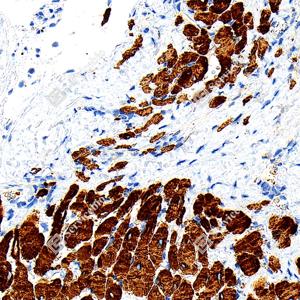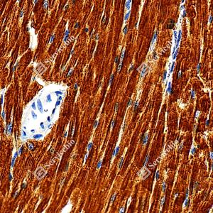 | IHC检测Slow Skeletal Myosin Heavy chain蛋白(货号 YB150155). 样品: 小鼠心, 4%多聚甲醛 (货号Y1112) 固定12-24小时. 抗原修复: 抗原修复仪 (货号 YRI-4),Tris-EDTA抗原修复液(pH 9.0) (货号Y1214), 水浴98℃, 20分钟. —抗: 1: 1000稀释, 4℃ 孵育过夜. 二抗: S-vision免疫组化多聚二抗(山羊抗兔),即用型 (货号Y1313), 室温孵育20分钟. |