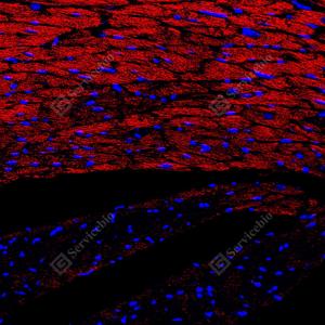 | IF检测Slow Skeletal Myosin Heavy chain蛋白(货号 YB150155)(红色). 样品: 小鼠心, 4%多聚甲醛 (货号Y1112) 固定12-24小时. 抗原修复: 抗原修复仪 (货号 YRI-4),Tris-EDTA抗原修复液(pH 9.0) (货号Y1214), 水浴98℃, 20分钟. 封闭: 3% BSA(货号YC305021)的PBS溶液, 室温孵育30分钟. —抗: 1: 1000稀释, 4℃ 孵育过夜. 二抗: Cy3标记山羊抗兔IgG (H+L) (货号YB21314), 1: 300稀释, 室温孵育1小时. |