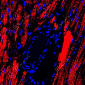 | IF检测Slow Skeletal Myosin Heavy chain蛋白(货号 YB150155)(红色). 样品: 大鼠心, 4%多聚甲醛 (货号Y1112) 固定12-24小时. 抗原修复: 抗原修复仪 (货号 YRI-4),Tris-EDTA抗原修复液(pH 9.0) (货号Y1214), 水浴98℃, 20分钟. 封闭: 3% BSA(货号YC305021)的PBS溶液, 室温孵育30分钟. —抗: 1: 1000稀释, 4℃ 孵育过夜. 二抗: Cy3标记山羊抗兔IgG (H+L) (货号YB21314), 1: 300稀释, 室温孵育1小时. |