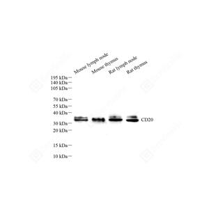 WB检测CD20蛋白(货号 YB155732). 样品: 经RIPA裂解液(货号Y2013)处理的蛋白质. 封闭: 3%脱脂牛奶(货号YC310012)溶于TBST溶液, 室温孵育1小时. —抗: 1: 500稀释, 4℃ 孵育过夜. 二抗: HRP标记山羊抗兔IgG (H+L) (货号YB23314), 1: 5000稀释, 室温孵育1小时. |