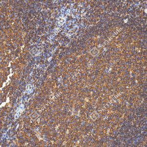 IHC检测CD20蛋白(货号 YB155732). 样品: 小鼠淋巴结, 4%多聚甲醛 (货号Y1112) 固定12-24小时. 抗原修复: Tris-EDTA抗原修复液 (pH 9.0) (货号Y1214), 高压锅均匀喷气计时2分钟. —抗: 1: 800稀释, 4℃ 孵育过夜. 二抗: S-vision免疫组化多聚二抗(山羊抗兔),即用型 (货号Y1313), 室温孵育20分钟. |