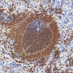 IHC检测CD20蛋白(货号 YB155732). 样品: 小鼠脾, 4%多聚甲醛 (货号Y1112) 固定12-24小时. 抗原修复: Tris-EDTA抗原修复液 (pH 9.0) (货号Y1214), 高压锅均匀喷气计时2分钟. —抗: 1: 800稀释, 4℃ 孵育过夜. 二抗: S-vision免疫组化多聚二抗(山羊抗兔),即用型 (货号Y1313), 室温孵育20分钟. |