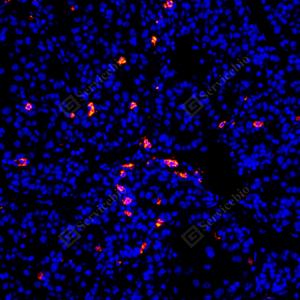 IF检测CD20蛋白(货号 YB155732)(红色). 样品: 人肺癌, 4%多聚甲醛 (货号Y1112) 固定12-24小时. 抗原修复: Tris-EDTA抗原修复液 (pH 9.0) (货号Y1214), 高压锅均匀喷气计时2分钟. 封闭: 3% BSA(货号YC305021)的PBS溶液, 室温孵育30分钟. —抗: 1: 400, 4℃ 孵育过夜. 二抗: Cy3标记山羊抗兔IgG (H+L) (货号YB21314), 1: 300稀释, 室温孵育1小时. |