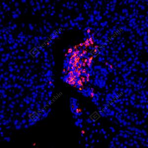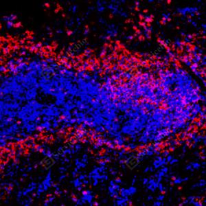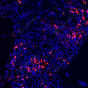 IF检测CD20蛋白(货号 YB155732)(红色). 样品: 小鼠脾, 4%多聚甲醛 (货号Y1112) 固定12-24小时. 抗原修复: Tris-EDTA抗原修复液 (pH 9.0) (货号Y1214), 高压锅均匀喷气计时2分钟. 封闭: 3% BSA(货号YC305021)的PBS溶液, 室温孵育30分钟. —抗: 1: 800, 4℃ 孵育过夜. 二抗: Cy3标记山羊抗兔IgG (H+L) (货号YB21314), 1: 300稀释, 室温孵育1小时. |