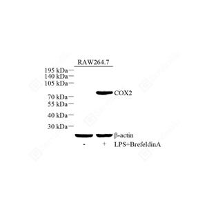 WB检测COX2/Cyclooxygenase 2蛋白(货号 YB155683). 样品: 经RIPA裂解液(货号Y2013)处理的蛋白质. 封闭: 3%脱脂牛奶(货号YC310012)溶于TBST溶液, 室温孵育1小时. —抗: 1: 500稀释, 4℃ 孵育过夜. 二抗: HRP标记山羊抗兔IgG (H+L) (货号YB23314), 1: 5000稀释, 室温孵育1小时. |