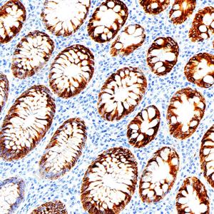 IHC检测COX2/Cyclooxygenase 2蛋白(货号 YB155683). 样品: 人结肠, 4%多聚甲醛 (货号Y1112) 固定12-24小时. 抗原修复: Tris-EDTA抗原修复液(pH 9.0) (货号Y1214), 高压锅均匀喷气计时2分钟. —抗: 1: 200稀释, 4℃ 孵育过夜. 二抗: S-vision免疫组化多聚二抗(山羊抗兔),即用型 (货号Y1313), 室温孵育20分钟. |