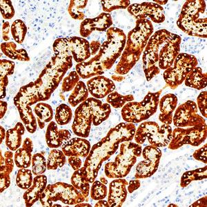 IHC检测COX2/Cyclooxygenase 2蛋白(货号 YB155683). 样品: 人肾, 4%多聚甲醛 (货号Y1112) 固定12-24小时. 抗原修复: Tris-EDTA抗原修复液(pH 9.0) (货号Y1214), 高压锅均匀喷气计时2分钟. —抗: 1: 200稀释, 4℃ 孵育过夜. 二抗: S-vision免疫组化多聚二抗(山羊抗兔),即用型 (货号Y1313), 室温孵育20分钟. |