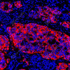 IF检测COX2/Cyclooxygenase 2蛋白(货号 YB155683)(红色). 样品: 人结肠癌, 4%多聚甲醛 (货号Y1112) 固定12-24小时. 抗原修复: Tris-EDTA抗原修复液(pH 9.0) (货号Y1214), 高压锅均匀喷气计时2分钟. 封闭: 3% BSA(货号YC305021)的PBS溶液, 室温孵育30分钟. —抗: 1: 200稀释, 4℃ 孵育过夜. 二抗: Cy3标记山羊抗兔IgG (H+L) (货号YB21314), 1: 300稀释, 室温孵育1小时. |