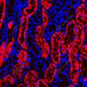 IF检测COX2/Cyclooxygenase 2蛋白(货号 YB155683)(红色). 样品: 人肾, 4%多聚甲醛 (货号Y1112) 固定12-24小时. 抗原修复: Tris-EDTA抗原修复液(pH 9.0) (货号Y1214), 高压锅均匀喷气计时2分钟. 封闭: 3% BSA(货号YC305021)的PBS溶液, 室温孵育30分钟. —抗: 1: 200稀释, 4℃ 孵育过夜. 二抗: Cy3标记山羊抗兔IgG (H+L) (货号YB21314), 1: 300稀释, 室温孵育1小时. |
