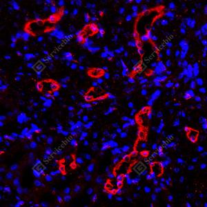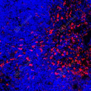 IF检测COX2/Cyclooxygenase 2蛋白(货号 YB155683)(红色). 样品: 小鼠脾, 4%多聚甲醛 (货号Y1112) 固定12-24小时. 抗原修复: Tris-EDTA抗原修复液(pH 9.0) (货号Y1214), 高压锅均匀喷气计时2分钟. 封闭: 3% BSA(货号YC305021)的PBS溶液, 室温孵育30分钟. —抗: 1: 200稀释, 4℃ 孵育过夜. 二抗: Cy3标记山羊抗兔IgG (H+L) (货号YB21314), 1: 300稀释, 室温孵育1小时. |