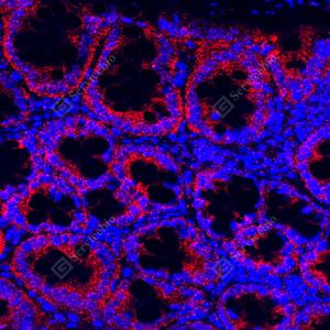 IF检测COX2/Cyclooxygenase 2蛋白(货号 YB155683)(红色). 样品: 大鼠结肠, 4%多聚甲醛 (货号Y1112) 固定12-24小时. 抗原修复: Tris-EDTA抗原修复液(pH 9.0) (货号Y1214), 高压锅均匀喷气计时2分钟. 封闭: 3% BSA(货号YC305021)的PBS溶液, 室温孵育30分钟. —抗: 1: 200稀释, 4℃ 孵育过夜. 二抗: Cy3标记山羊抗兔IgG (H+L) (货号YB21314), 1: 300稀释, 室温孵育1小时. |