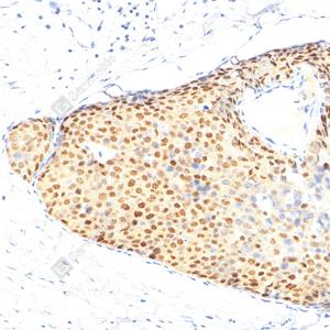 | IHC检测Estrogen Receptor alpha蛋白(货号 YB15216). 样品: 人乳腺癌, 4%多聚甲醛 (货号Y1112) 固定12-24小时. 抗原修复: 柠檬酸抗原修复液(干粉, pH 6.0) (Y1212), 高压锅均匀喷气计时2分钟. —抗: 1: 1000稀释, 4℃ 孵育过夜. 二抗: S-vision免疫组化多聚二抗(山羊抗兔),即用型 (货号Y1313), 室温孵育20分钟. |