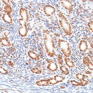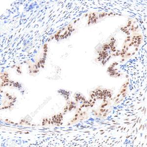 | IHC检测Estrogen Receptor alpha蛋白(货号 YB15216). 样品: 小鼠子宫, 4%多聚甲醛 (货号Y1112) 固定12-24小时. 抗原修复: 柠檬酸抗原修复液(干粉, pH 6.0) (Y1212), 高压锅均匀喷气计时2分钟. —抗: 1: 1000稀释, 4℃ 孵育过夜. 二抗: S-vision免疫组化多聚二抗(山羊抗兔),即用型 (货号Y1313), 室温孵育20分钟. |