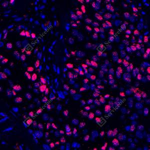 | IF检测Estrogen Receptor alpha蛋白(货号 YB15216)(红色). 样品: 人乳腺癌, 4%多聚甲醛 (货号Y1112) 固定12-24小时. 抗原修复: 柠檬酸抗原修复液(干粉, pH 6.0) (Y1212), 高压锅均匀喷气计时2分钟. 封闭: 3% BSA(货号YC305021)的PBS溶液, 室温孵育30分钟. —抗: 1: 1000稀释, 4℃ 孵育过夜. 二抗: Cy3标记山羊抗兔IgG (H+L) (货号YB21314), 1: 300稀释, 室温孵育1小时. |