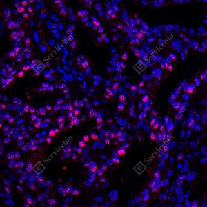 | IF检测Estrogen Receptor alpha蛋白(货号 YB15216)(红色). 样品: 小鼠卵巢, 4%多聚甲醛 (货号Y1112) 固定12-24小时. 抗原修复: 柠檬酸抗原修复液(干粉, pH 6.0) (Y1212), 高压锅均匀喷气计时2分钟. 封闭: 3% BSA(货号YC305021)的PBS溶液, 室温孵育30分钟. —抗: 1: 1000稀释, 4℃ 孵育过夜. 二抗: Cy3标记山羊抗兔IgG (H+L) (货号YB21314), 1: 300稀释, 室温孵育1小时. |