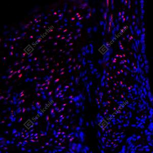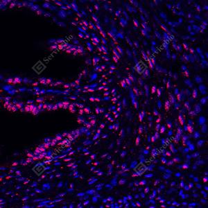 | IF检测Estrogen Receptor alpha蛋白(货号 YB15216)(红色). 样品: 大鼠输卵管, 4%多聚甲醛 (货号Y1112) 固定12-24小时. 抗原修复: 柠檬酸抗原修复液(干粉, pH 6.0) (Y1212), 高压锅均匀喷气计时2分钟. 封闭: 3% BSA(货号YC305021)的PBS溶液, 室温孵育30分钟. —抗: 1: 1000稀释, 4℃ 孵育过夜. 二抗: Cy3标记山羊抗兔IgG (H+L) (货号YB21314), 1: 300稀释, 室温孵育1小时. |