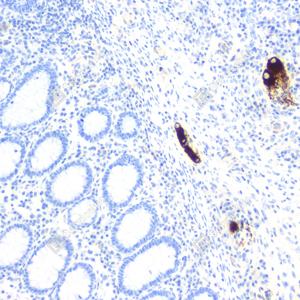| IHC检测MAP2蛋白(货号 YB155570). 样品: 小鼠结肠, 4%多聚甲醛 (货号Y1112) 固定12-24小时. 抗原修复: 柠檬酸抗原修复液(干粉, pH 6.0) (Y1212), 高压锅均匀喷气计时2分钟. —抗: 1: 300稀释, 4℃ 孵育过夜. 二抗: S-vision免疫组化多聚二抗(山羊抗兔),即用型 (货号Y1313), 室温孵育20分钟. |