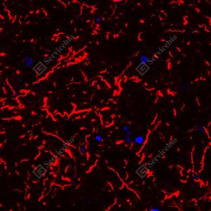 | IF检测MAP2蛋白(货号 YB155570)(红色). 样品: 人脑, 4%多聚甲醛 (货号Y1112) 固定12-24小时. 抗原修复: 柠檬酸抗原修复液(干粉, pH 6.0) (Y1212), 高压锅均匀喷气计时2分钟. 封闭: 3% BSA(货号YC305021)的PBS溶液, 室温孵育30分钟. —抗: 1: 300稀释, 4℃ 孵育过夜. 二抗: Cy3标记山羊抗兔IgG (H+L) (货号YB21314), 1: 300稀释, 室温孵育1小时. |
