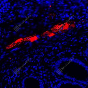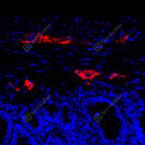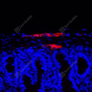 | IF检测MAP2蛋白(货号 YB155570)(红色). 样品: 人结肠, 4%多聚甲醛 (货号Y1112) 固定12-24小时. 抗原修复: 柠檬酸抗原修复液(干粉, pH 6.0) (Y1212), 高压锅均匀喷气计时2分钟. 封闭: 3% BSA(货号YC305021)的PBS溶液, 室温孵育30分钟. —抗: 1: 300稀释, 4℃ 孵育过夜. 二抗: Cy3标记山羊抗兔IgG (H+L) (货号YB21314), 1: 300稀释, 室温孵育1小时. |
