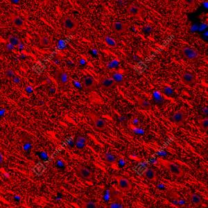 | IF检测MAP2蛋白(货号 YB155570)(红色). 样品: 大鼠脑, 4%多聚甲醛 (货号Y1112) 固定12-24小时. 抗原修复: 柠檬酸抗原修复液(干粉, pH 6.0) (Y1212), 高压锅均匀喷气计时2分钟. 封闭: 3% BSA(货号YC305021)的PBS溶液, 室温孵育30分钟. —抗: 1: 300稀释, 4℃ 孵育过夜. 二抗: Cy3标记山羊抗兔IgG (H+L) (货号YB21314), 1: 300稀释, 室温孵育1小时. |