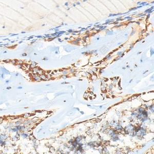 IHC检测BMP2蛋白(货号 YB15263). 样品: 小鼠骨, 4%多聚甲醛 (货号Y1112) 固定12-24小时. 抗原修复: Tris-EDTA抗原修复液(pH 9.0) (Y1214), 98℃, 20分钟. —抗: 1: 500稀释, 4℃ 孵育过夜. 二抗: S-vision免疫组化多聚二抗(山羊抗兔),即用型 (货号Y1313), 室温孵育20分钟. |