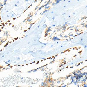 IHC检测BMP2蛋白(货号 YB15263). 样品: 大鼠骨, 4%多聚甲醛 (货号Y1112) 固定12-24小时. 抗原修复: Tris-EDTA抗原修复液(pH 9.0) (Y1214), 98℃, 20分钟. —抗: 1: 500稀释, 4℃ 孵育过夜. 二抗: S-vision免疫组化多聚二抗(山羊抗兔),即用型 (货号Y1313), 室温孵育20分钟. |