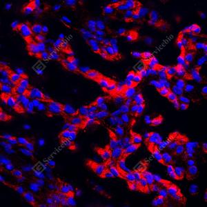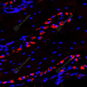 IF检测BMP2蛋白(货号 YB15263)(红色). 样品: 小鼠骨, 4%多聚甲醛 (货号Y1112) 固定12-24小时. 抗原修复: Tris-EDTA抗原修复液(pH 9.0) (Y1214), 98℃, 20分钟. 封闭: 3% BSA(货号YC305021)的PBS溶液, 室温孵育30分钟. —抗: 1: 500稀释, 4℃ 孵育过夜. 二抗: Cy3标记山羊抗兔IgG (H+L) (货号YB21314), 1: 300稀释, 室温孵育1小时. |