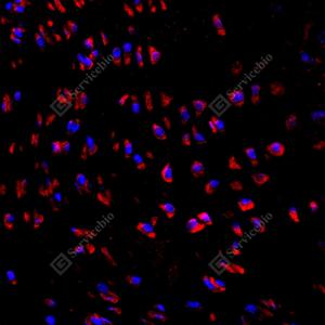 IF检测BMP2蛋白(货号 YB15263)(红色). 样品: 大鼠骨, 4%多聚甲醛 (货号Y1112) 固定12-24小时. 抗原修复: Tris-EDTA抗原修复液(pH 9.0) (Y1214), 98℃, 20分钟. 封闭: 3% BSA(货号YC305021)的PBS溶液, 室温孵育30分钟. —抗: 1: 500稀释, 4℃ 孵育过夜. 二抗: Cy3标记山羊抗兔IgG (H+L) (货号YB21314), 1: 300稀释, 室温孵育1小时. |