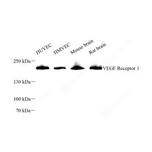 WB检测VEGF Receptor 1蛋白(货号 YB154211). 样品: 经RIPA裂解液(货号Y2013)处理的蛋白质. 封闭: 3%脱脂牛奶(货号YC310012)溶于TBST溶液, 室温孵育1小时. —抗: 1: 2000稀释, 4℃ 孵育过夜. 二抗: HRP标记山羊抗兔IgG (H+L) (货号YB23314), 1: 5000稀释, 室温孵育1小时. |