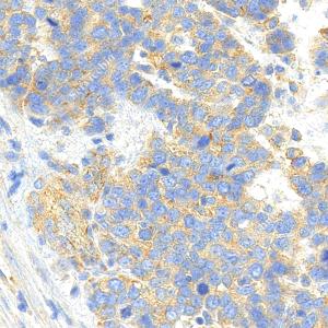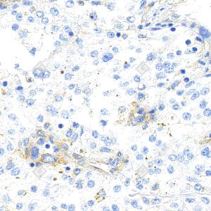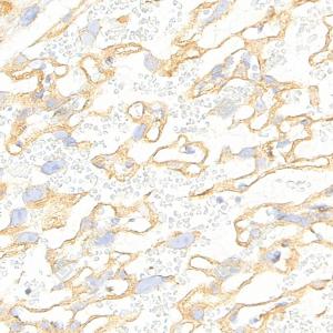 IHC检测VEGF Receptor 1蛋白(货号 YB154211). 样品: 人肾癌, 4%多聚甲醛 (货号Y1112) 固定12-24小时. 抗原修复: Tris-EDTA抗原修复液(pH 9.0) (货号Y1214), 高压锅均匀喷气计时2分钟. —抗: 1: 1000稀释, 4℃ 孵育过夜. 二抗: S-vision免疫组化多聚二抗(山羊抗兔),即用型 (货号Y1313), 室温孵育20分钟. |