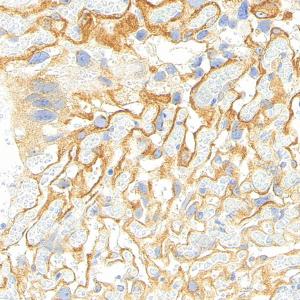 IHC检测VEGF Receptor 1蛋白(货号 YB154211). 样品: 小鼠胎盘, 4%多聚甲醛 (货号Y1112) 固定12-24小时. 抗原修复: Tris-EDTA抗原修复液(pH 9.0) (货号Y1214), 高压锅均匀喷气计时2分钟. —抗: 1: 1000稀释, 4℃ 孵育过夜. 二抗: S-vision免疫组化多聚二抗(山羊抗兔),即用型 (货号Y1313), 室温孵育20分钟. |
