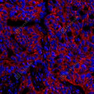 IF检测VEGF Receptor 1蛋白(货号 YB154211)(红色). 样品: 人卵巢癌, 4%多聚甲醛 (货号Y1112) 固定12-24小时. 抗原修复: Tris-EDTA抗原修复液(pH 9.0) (货号Y1214), 高压锅均匀喷气计时2分钟. 封闭: 3% BSA(货号YC305021)的PBS溶液, 室温孵育30分钟. —抗: 1: 1000稀释, 4℃ 孵育过夜. 二抗: Cy3标记山羊抗兔IgG (H+L) (货号YB21314), 1: 300稀释, 室温孵育1小时. |