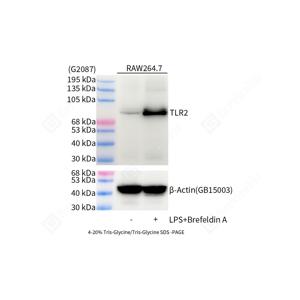 | WB检测TLR2蛋白(货号 YB15565). 样品: 经RIPA裂解液(货号Y2013)处理的蛋白质. 封闭: 3%脱脂牛奶(货号YC310012)溶于TBST溶液, 室温孵育1小时. —抗: 1: 2000稀释, 4℃ 孵育过夜. 二抗: HRP标记山羊抗兔IgG (H+L) (货号YB23314), 1: 5000稀释, 室温孵育1小时. |
