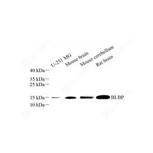 WB检测BLBP蛋白(货号 YB150037). 样品: 经RIPA裂解液(货号Y2013)处理的蛋白质. 封闭: 3%脱脂牛奶(货号YC310012)溶于TBST溶液, 室温孵育1小时. —抗: 1: 1000稀释, 4℃ 孵育过夜. 二抗: HRP标记山羊抗兔IgG (H+L) (货号YB23314), 1: 5000稀释, 室温孵育1小时. |