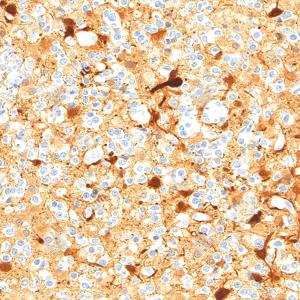 IHC检测BLBP蛋白(货号 YB150037). 样品: 人多形性胶质母细胞瘤, 4%多聚甲醛 (货号Y1112) 固定12-24小时. 抗原修复: Tris-EDTA抗原修复液(pH 9.0) (Y1214), 98℃, 20分钟. —抗: 1: 2000稀释, 4℃ 孵育过夜. 二抗: S-vision免疫组化多聚二抗(山羊抗兔),即用型 (货号Y1313), 室温孵育20分钟. |