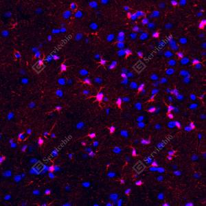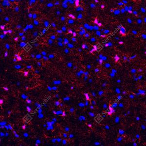 IF检测BLBP蛋白(货号 YB150037)(红色). 样品: 小鼠脑, 4%多聚甲醛 (货号Y1112) 固定12-24小时. 抗原修复: Tris-EDTA抗原修复液(pH 9.0) (货号Y1214), 高压锅均匀喷气计时2分钟. 封闭: 3% BSA(货号YC305021)的PBS溶液, 室温孵育30分钟. —抗: 1: 1000稀释, 4℃ 孵育过夜. 二抗: Cy3标记山羊抗兔IgG (H+L) (货号YB21314), 1: 300稀释, 室温孵育1小时. |