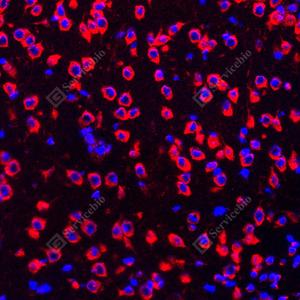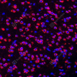 IF检测EIF2S1蛋白(货号 YB150036)(红色). 样品: 小鼠脑, 4%多聚甲醛 (货号Y1112) 固定12-24小时. 抗原修复: Tris-EDTA抗原修复液(pH 9.0) (货号Y1214), 高压锅均匀喷气计时2分钟. 封闭: 3% BSA(货号YC305021)的PBS溶液, 室温孵育30分钟. —抗: 1: 1000稀释, 4℃ 孵育过夜. 二抗: Cy3标记山羊抗兔IgG (H+L) (货号YB21314), 1: 300稀释, 室温孵育1小时. |