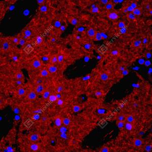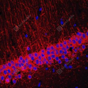 IF检测Acetylcholinesterase蛋白(货号 YB15049)(红色). 样品: 小鼠海马区, 4%多聚甲醛 (货号Y1112) 固定12-24小时. 抗原修复: 柠檬酸抗原修复液(干粉, pH 6.0) (Y1212), 高压锅均匀喷气计时2分钟. 封闭: 3% BSA(货号YC305021)的PBS溶液, 室温孵育30分钟. —抗: 1: 1000稀释, 4℃ 孵育过夜. 二抗: Cy3标记山羊抗兔IgG (H+L) (货号YB21314), 1: 300稀释, 室温孵育1小时. |