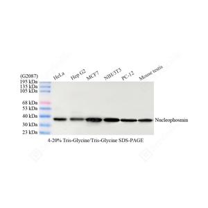 WB检测Nucleophosmin蛋白(货号 YB151054). 样品: 经RIPA裂解液(货号Y2013)处理的蛋白质. 封闭: 3%脱脂牛奶(货号YC310012)溶于TBST溶液, 室温孵育1小时. —抗: 1: 2000稀释, 4℃ 孵育过夜. 二抗: HRP标记山羊抗小鼠IgG (H+L) (货号YB23312), 1: 5000稀释, 室温孵育1小时. |