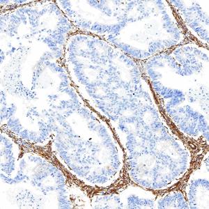 IHC检测Caldesmon/CDM蛋白(货号 YB150040). 样品: 人结肠癌, 4%多聚甲醛 (货号Y1112) 固定12-24小时. 抗原修复: 柠檬酸抗原修复液(干粉, pH 6.0) (Y1212), 高压锅均匀喷气计时2分钟. —抗: 1: 4000稀释, 4℃ 孵育过夜. 二抗: S-vision免疫组化多聚二抗(山羊抗兔),即用型 (货号Y1313), 室温孵育20分钟. |
