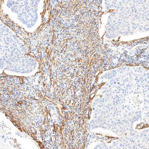IHC检测Caldesmon/CDM蛋白(货号 YB150040). 样品: 人肺癌, 4%多聚甲醛 (货号Y1112) 固定12-24小时. 抗原修复: 柠檬酸抗原修复液(干粉, pH 6.0) (Y1212), 高压锅均匀喷气计时2分钟. —抗: 1: 4000稀释, 4℃ 孵育过夜. 二抗: S-vision免疫组化多聚二抗(山羊抗兔),即用型 (货号Y1313), 室温孵育20分钟. |